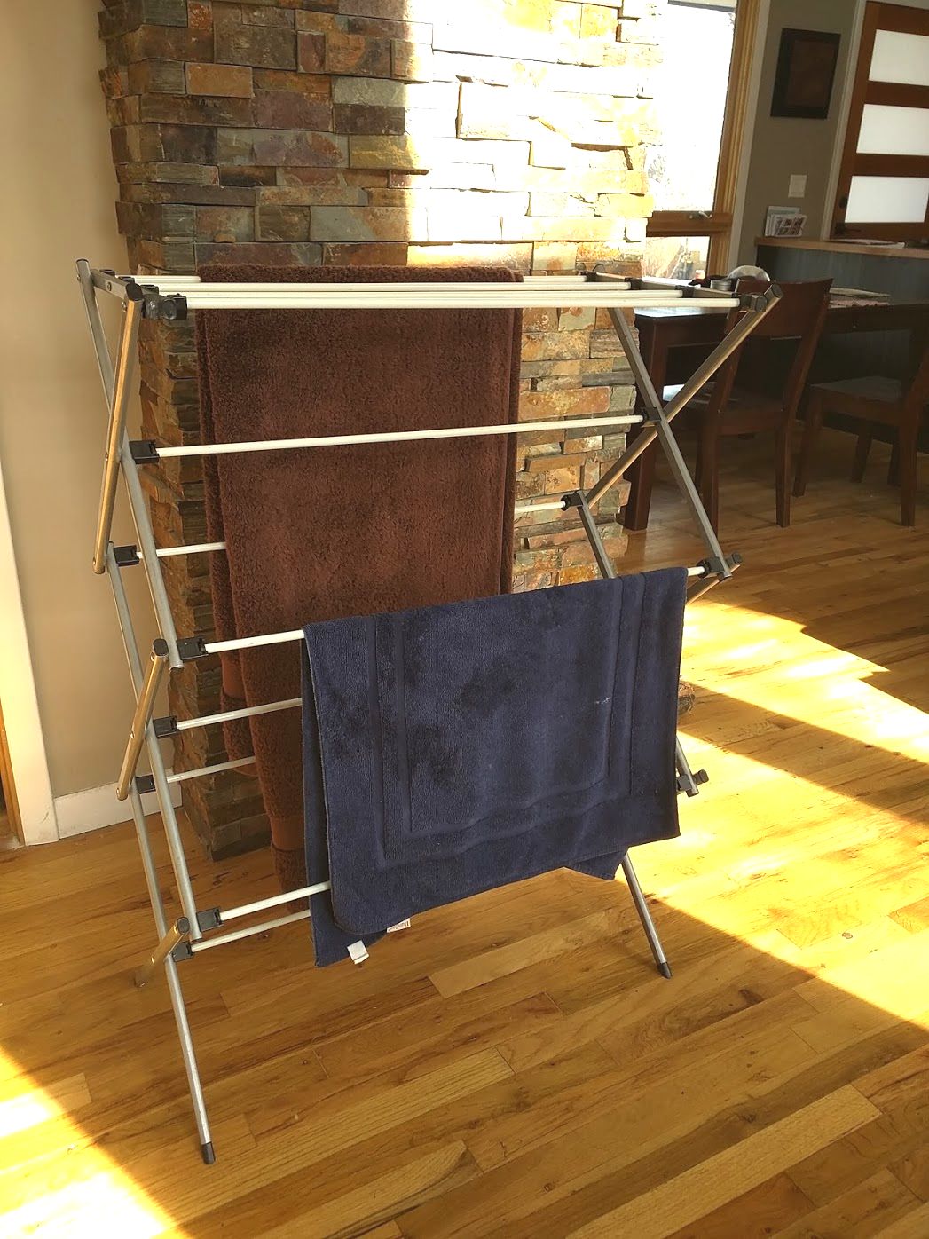 You see, we both had the desire for natural clothes drying, but none of the right equipment to actually do it. So I have just been hanging up my wet clothes on hangers, towel racks, chairs, over doorways, etc, for the last few years. It’s not quite as bad as it sounds: since we live in Colorado at over 5,000 feet above sea level, the dry low-pressure air sucks away the moisture in only a few hours, as opposed to the 1-2 days it could take to dry a poorly hung pair of jeans on the East Coast. Then I put all the clothes away.