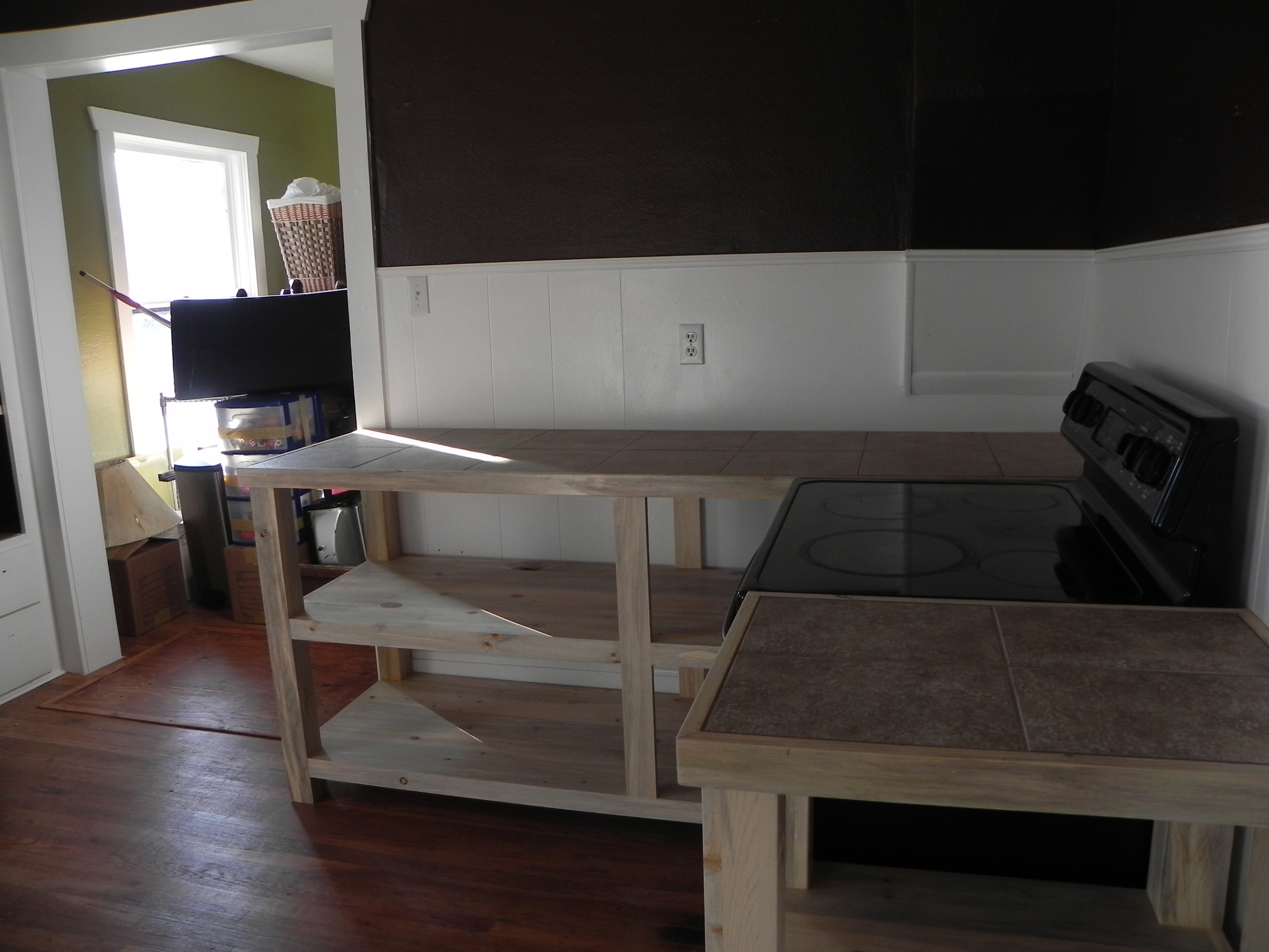After: Reasonable smooth-top range (craigslist) nestled between simple custom countertop units. You can also see the new paint and bigger doorway to living room.