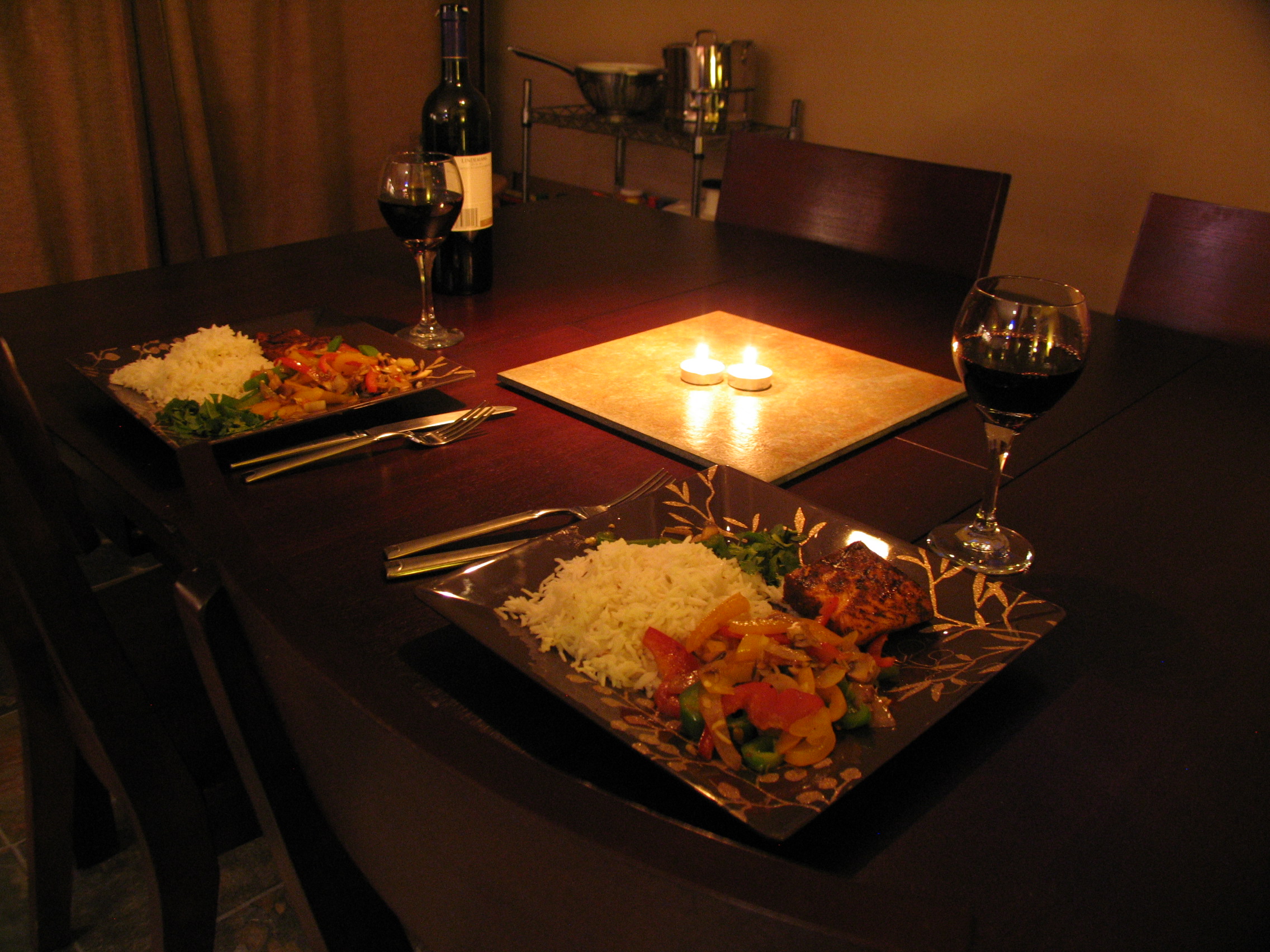 Here’s the scene lit with a brand-new LED bulb (color temperature a slightly cooler 3000K, but still called “warm white”). Contrast and shadows are sharper, scene is classier.
