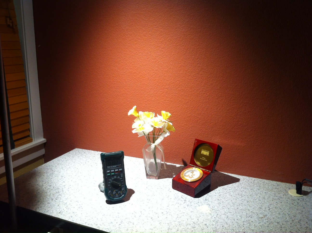 Here’s the same scene lit up with a “warm white” CFL bulb. Note the more reddish hue (which I find a bit nicer) and the continued wide light dispersion.