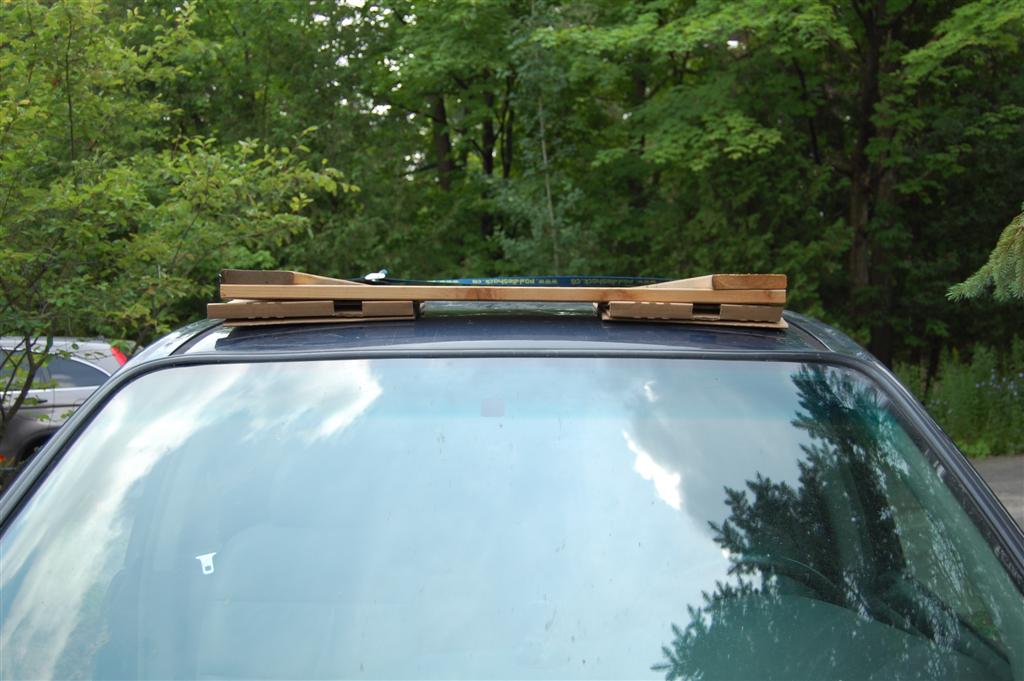 Strength is no problem with a rack like this – through the natural flex of the wood, it automatically distributes the weight right along the interior frame of the car’s roof, which is located at the outside corners right under the stock roof rails. I have carried up to 500 pounds on racks of this style without adverse effects (although the car’s cornering is affected by a top-heavy load, so take it slow).