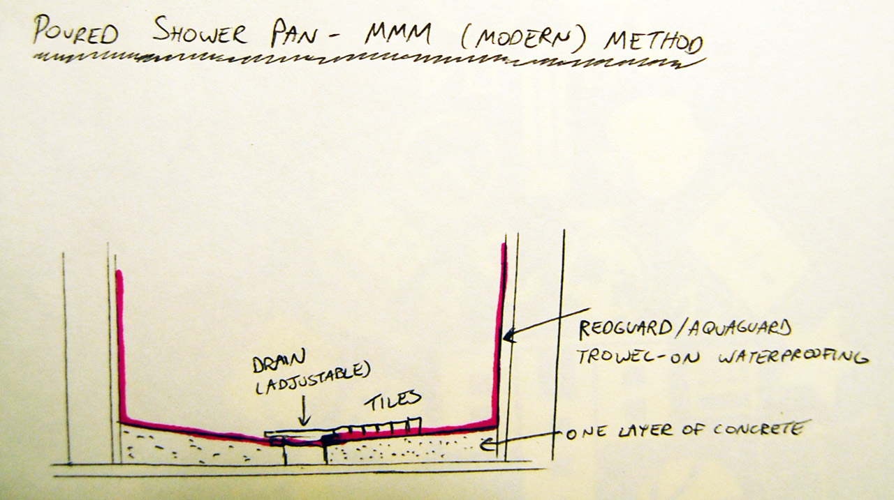 This is the part where things get exciting, and this article will hopefully save DIY shower builders some time and money. In the olden days (and still today for the most part), poured showerpans were done in three steps: the poured pre-slope, the rubber liner, then the poured top slope. It looked roughly like this: