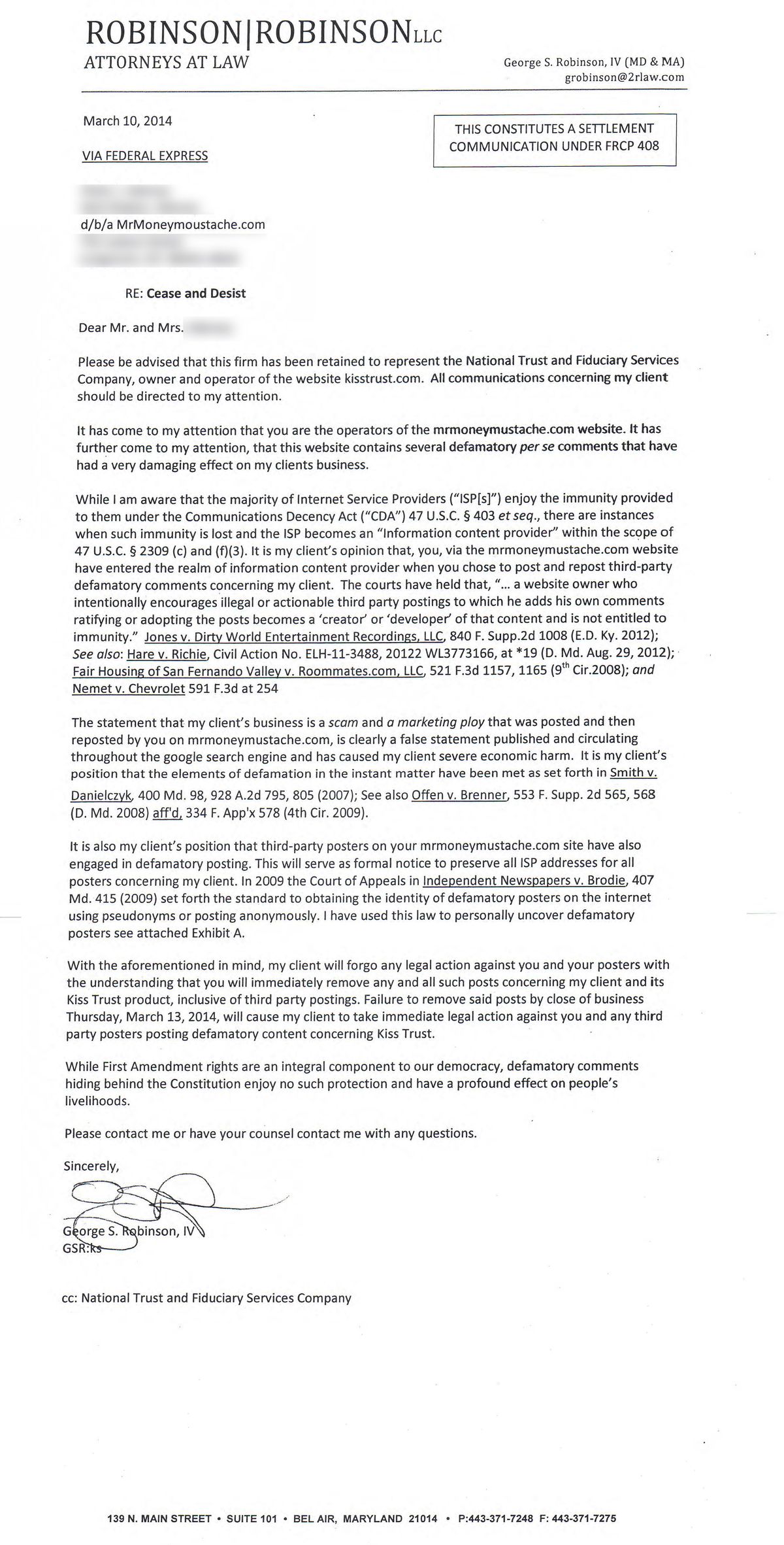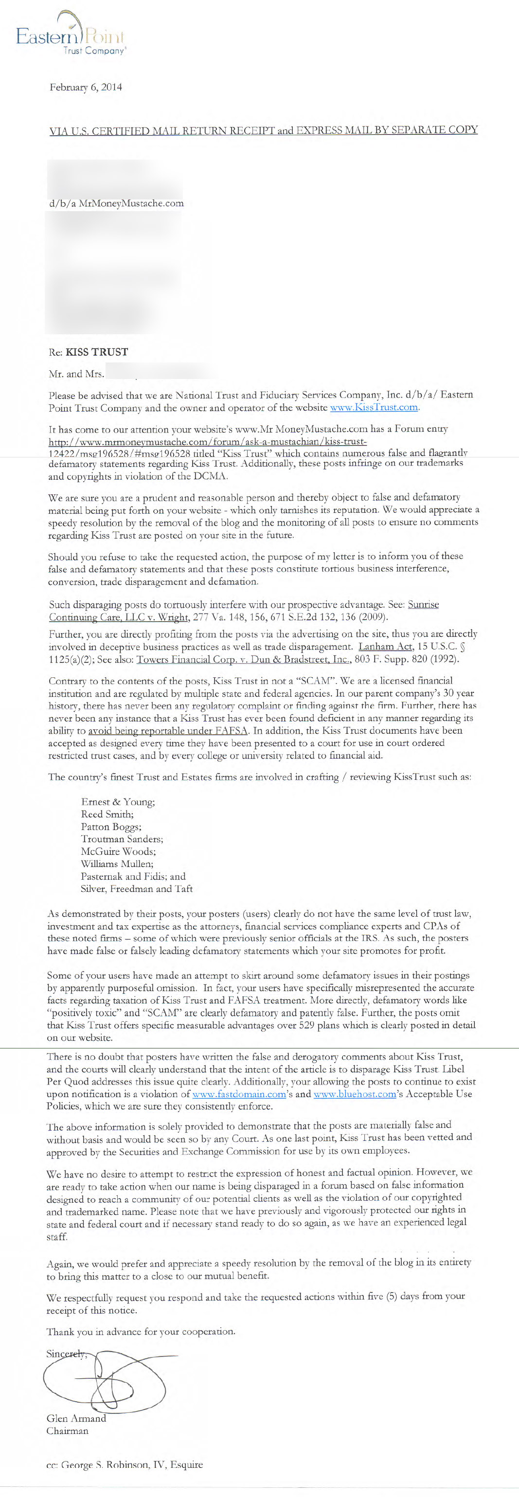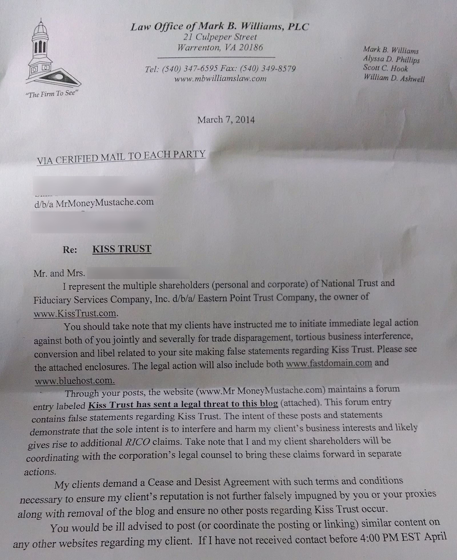 Update: After further advice from the MMM legal team, I can now safely share more details. The company is called Kiss Trust. The forum thread they are objecting to is this one right here. Their law firm is called “Law office of Mark B. Williams, PLC”, and here is a copy of the letter they sent me: