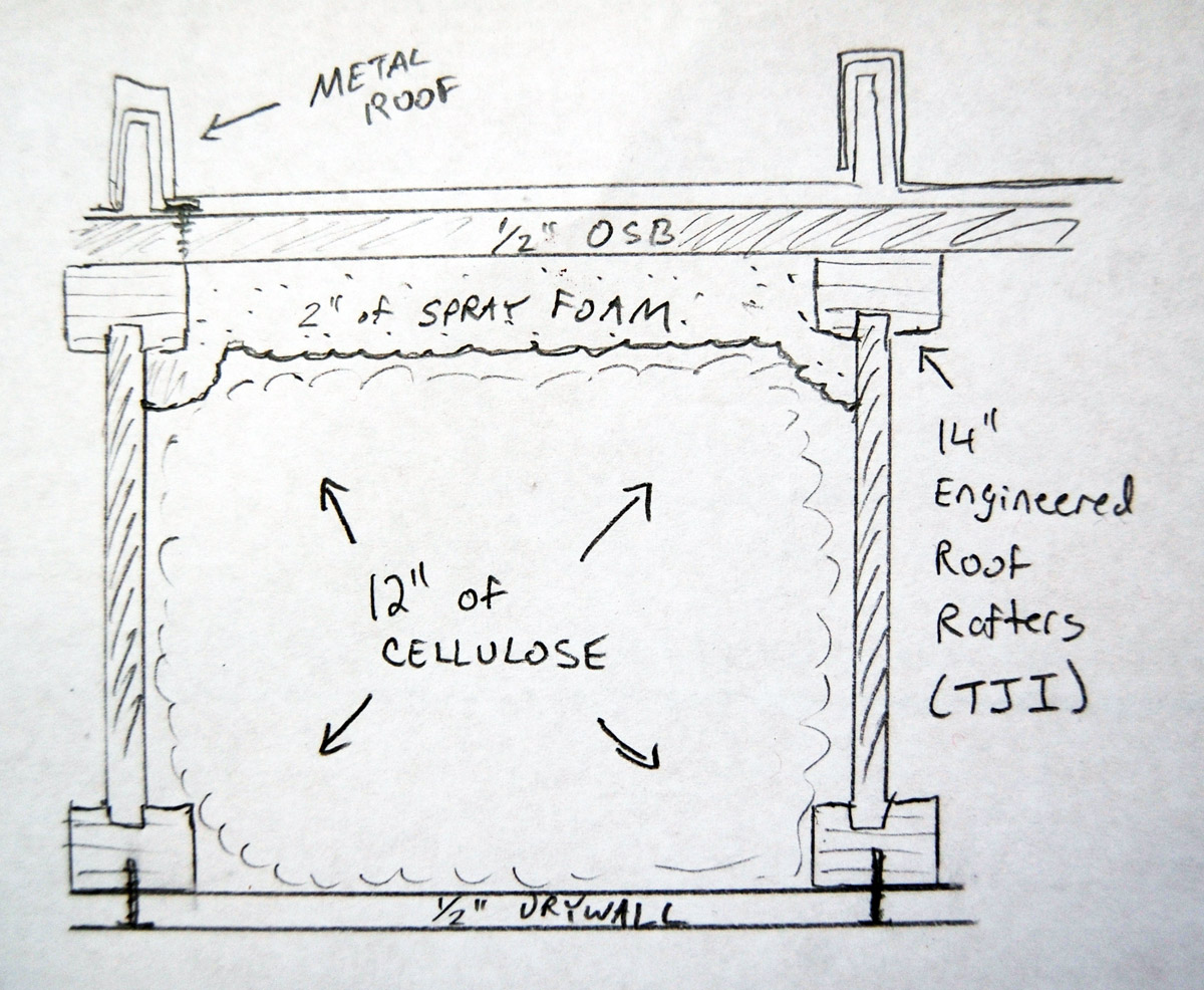 A cross section of my own roof. 2″ of spray foam plus 12″ of cellulose gives me almost R-60 total insulation! With this method, you don’t need the plastic vapor barrier below the rafters.