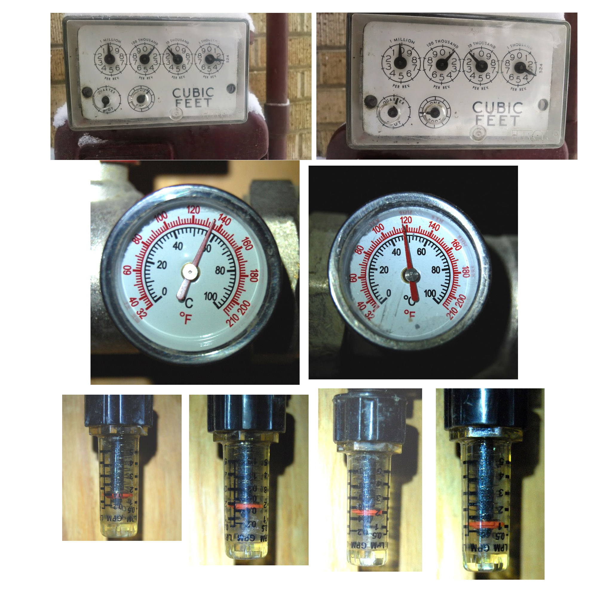 To test this, I had to calculate the amount of natural gas I burned every hour, and compare it to the amount of heat actually being pumped into the house. I did this by cranking up the system on a cold day and taking “before” and “after” readings of the gas meter, and noting the flow rate and temperature drop** across the whole system: