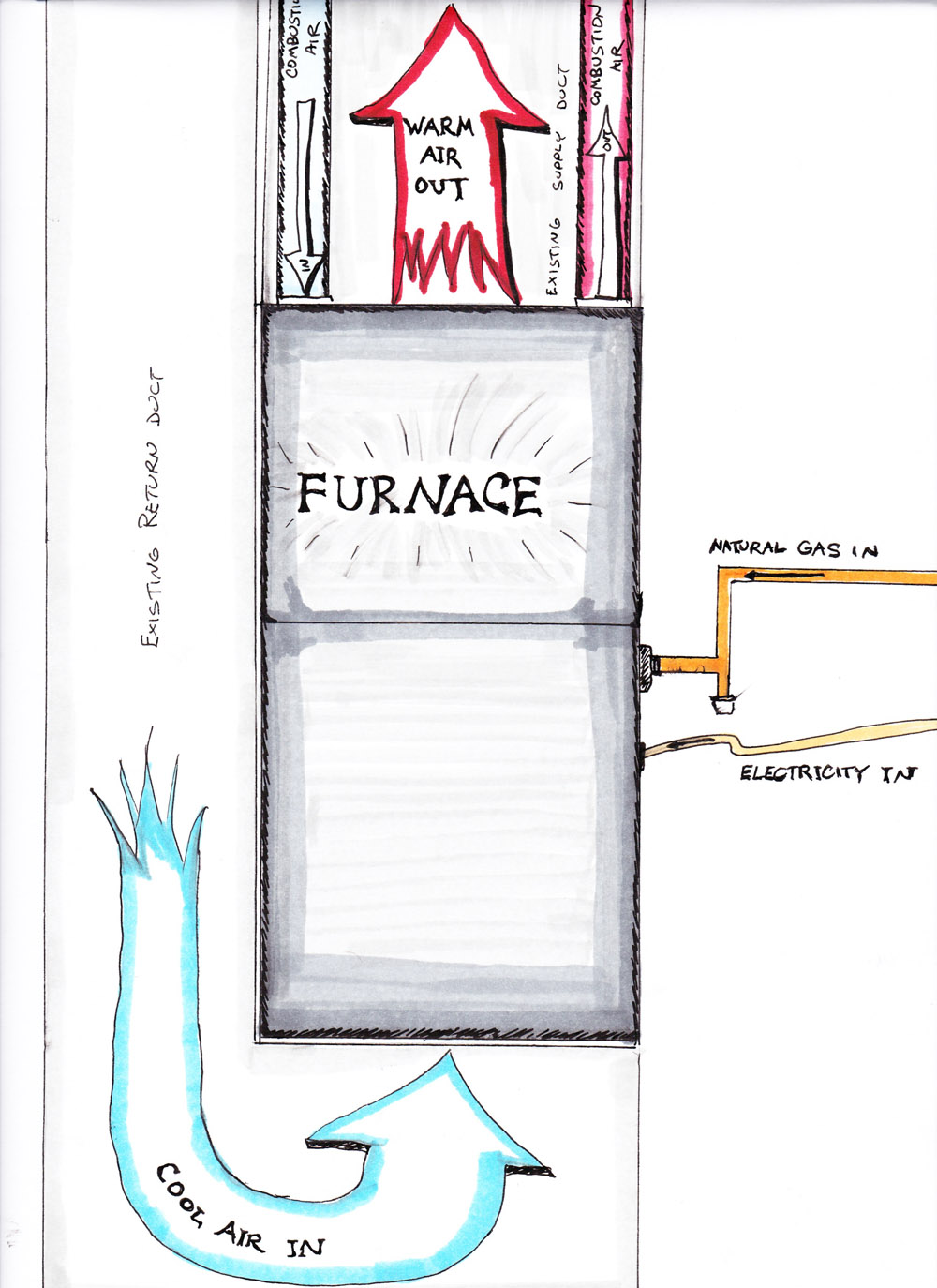 When you get right down to it, a gas furnace is just a box-shaped heater connected to some tubes. These days, they have added more internal complexity to make them more efficient, but all you really need to know as the installer is this: Cold Air in, Warm air out, Gas and Electricity in, Combustion air In and Out. It gets even easier if you write these same things on a picture of a box (aka furnace).