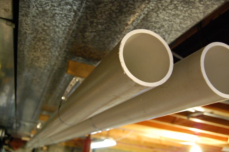 pvcHere we are just running two pieces of 3″ PVC pipe (you can even use 2″ for shorter runs) from the furnace to an inconspicuous place on the outside of your house. It’s a fun design puzzle, deciding how to route the pipe and figuring out which fittings to use to accomplish it. Your goal is a classy looking job. You cut it with a miter saw or sawzall, and glue it with purple PVC primer and PVC glue. Again, watch a few videos if you need to learn how to handle this stuff.