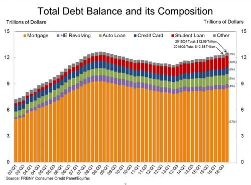 Household debt levels have risen back to their pre-crash peak, and with an even worse composition: more student loans, and a record level of auto loans, the most ridiculous and self-destructive piece of personal finance outside of mortgaging your shins to a loan shark to afford tonight’s cocaine.