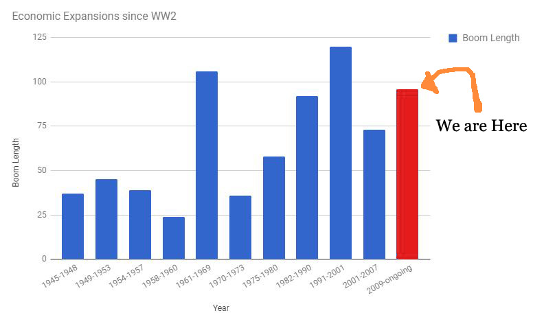 The final piece of evidence comes from just how long the present party has gone on. If you look at the history of economic expansions – how long we have gone since the last recession – we are currently enjoying the third longest one in history: