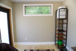 So to keep the frugal trend going with the floor, I decided to try just smooth sanding the raw OSB with a good belt sander and clearcoating it with this really tough floor urethane. It came out looking pleasant, and is very durable and mud/gravel resistant. But I found the sanding was a slow process – throwing in a basic but attractive engineered wood floor at under $2 per square foot is probably a better idea next time at only slightly higher cost, unless you are building a big enough space to justify renting a real floor sander.