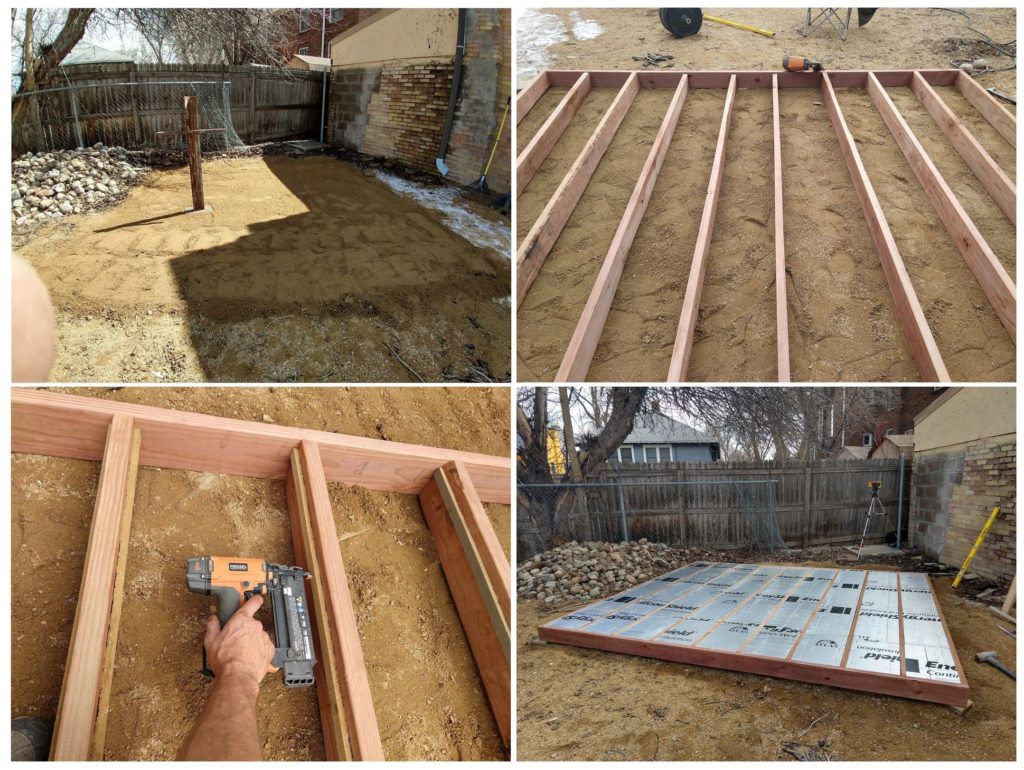 Once I had those floor joists super square and level (hammering in stone shims under corners and joists as needed), I added a layer of standard 3/4″ OSB subfloor and nailed it down judiciously with the framing nailer to ensure a very rigid base. Then started to make the walls.